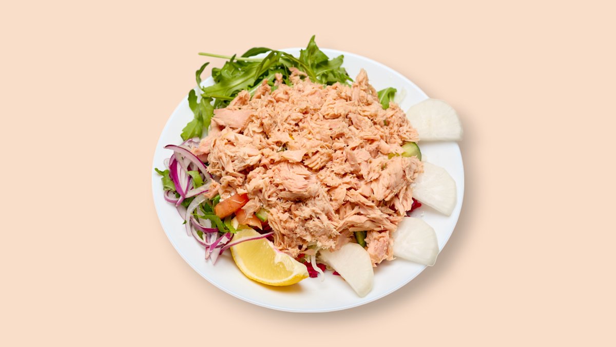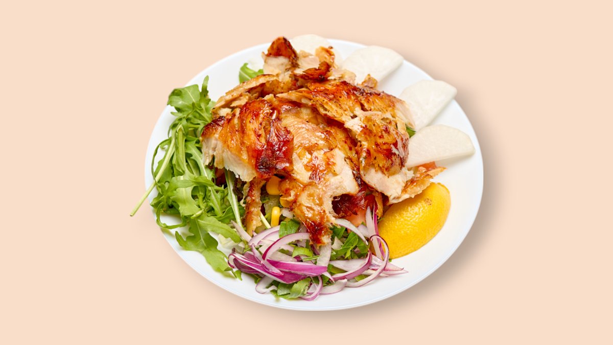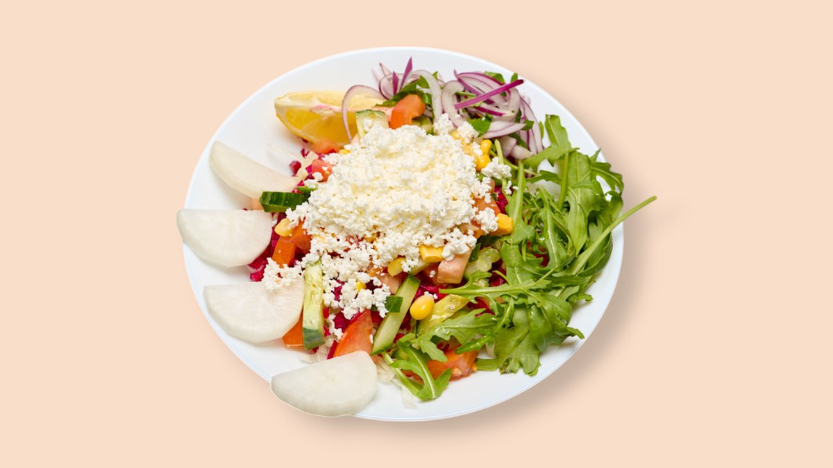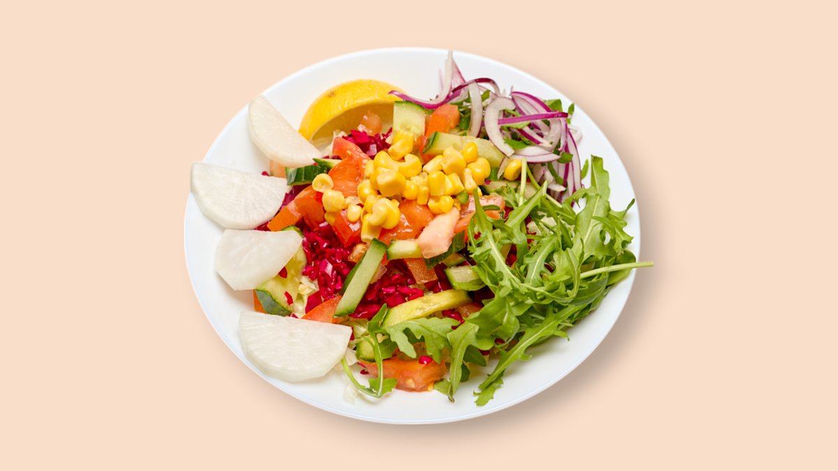 with iceberg lettuce, cucumbers, tomatoes, onions, red cabbage and a sauce of your choice