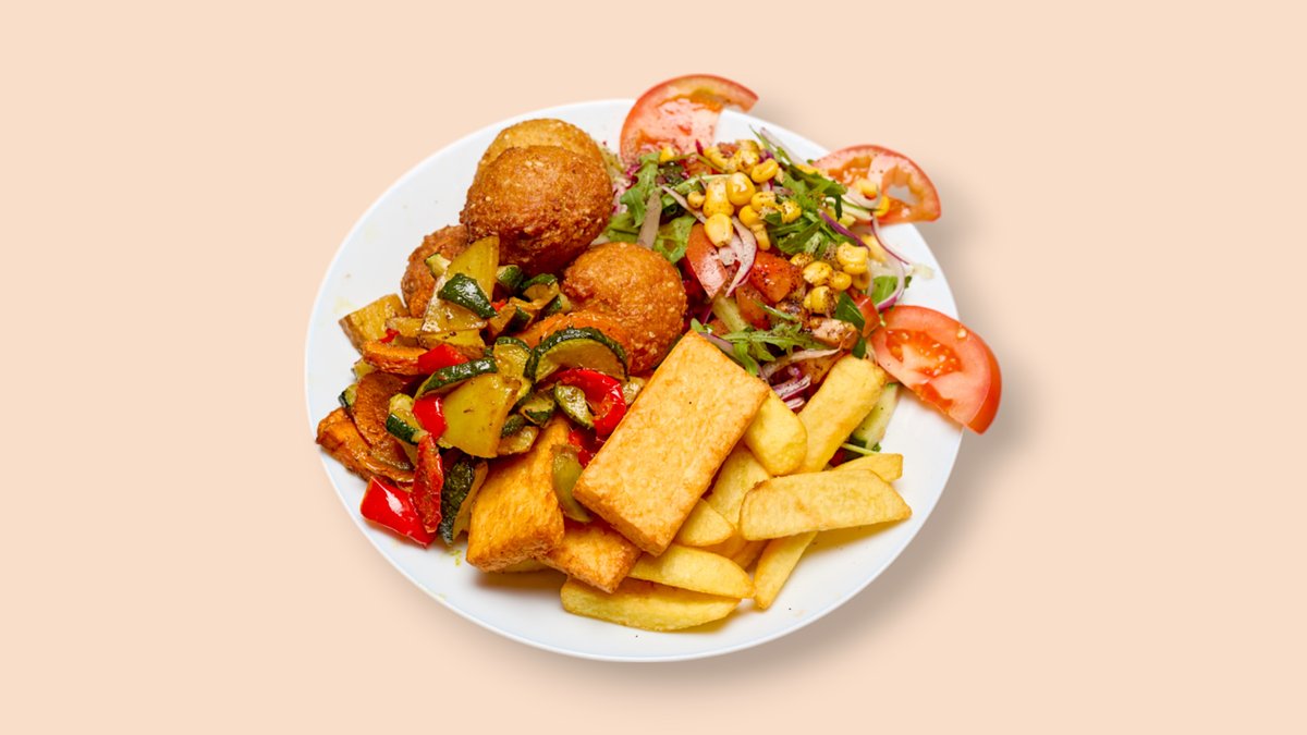 all vegetarian dishes are prepared with iceberg lettuce, cucumbers, tomatoes, onions, red cabbage and a sauce of your choice