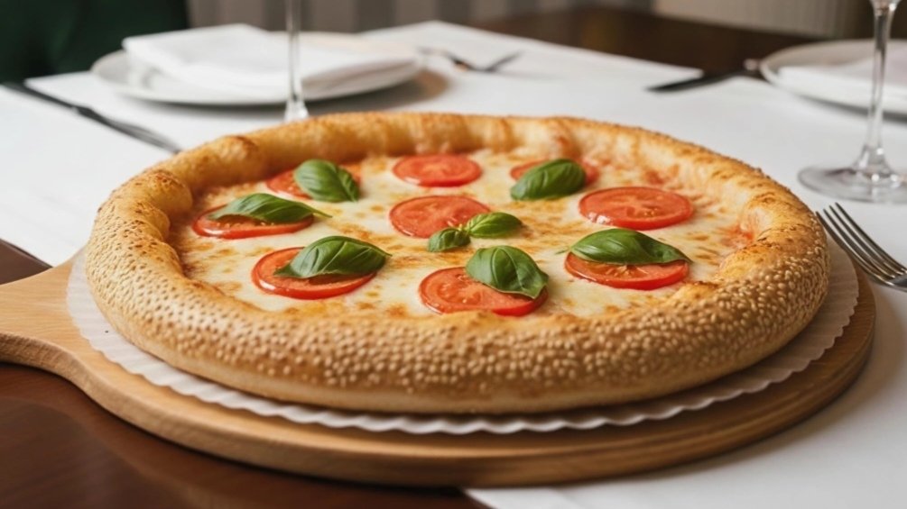 alle Pizzen sind mit Käse-Sesam-Kruste, Tomatensoße und extra Mozzarella zubereitet