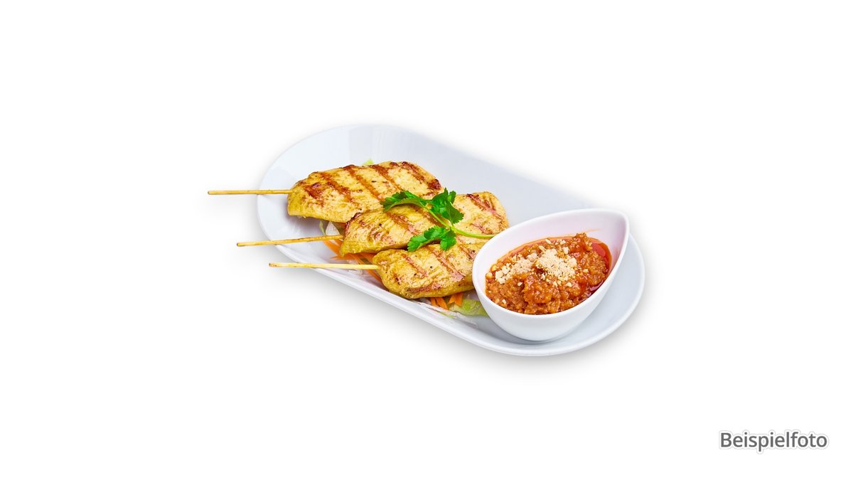 marinated chicken skewers with turmeric, spice mix and lime leaves, served with peanut sauce.