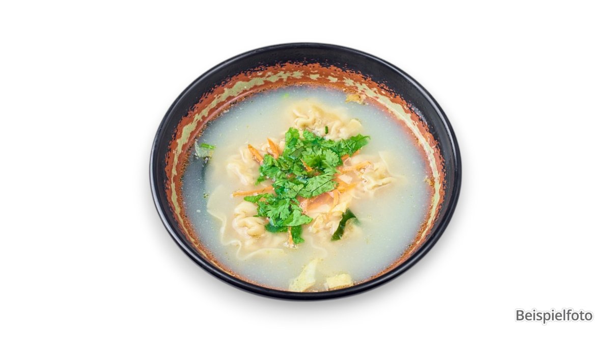 wonton dough soup with chicken, shrimp filling, vegetables and Vietnamese herbs
