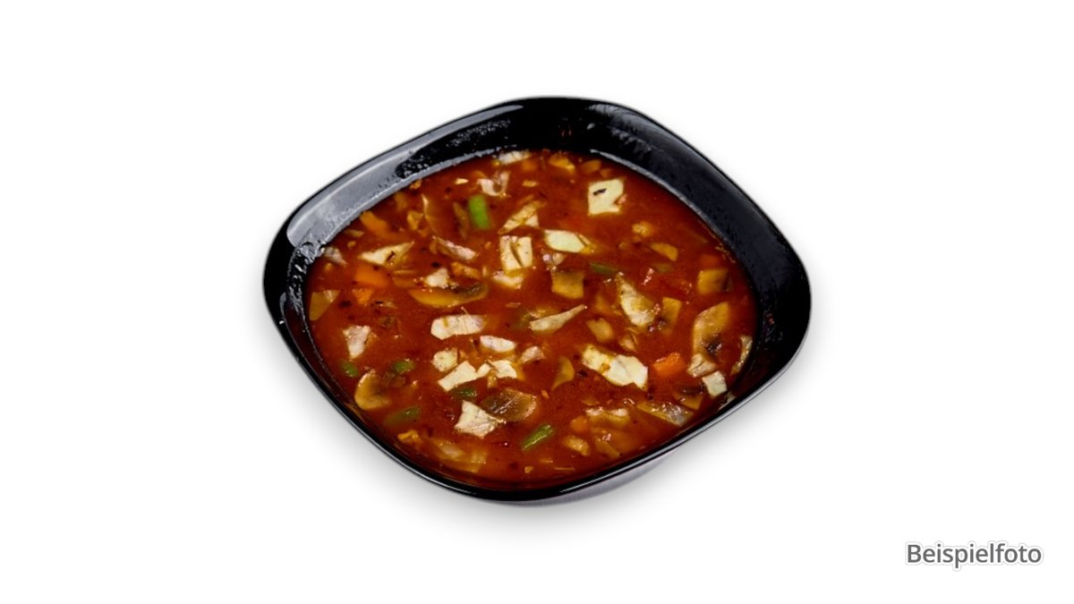hot and sour soup with duck meat, morel mushrooms, carrots, bell peppers, mushrooms and coriander
