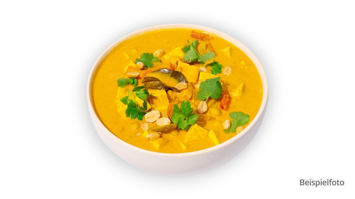 rice noodles in a creamy yellow coconut curry sauce with seasonal vegetables, fresh salad, peanuts, fried onions, herbs and one topping of your choice