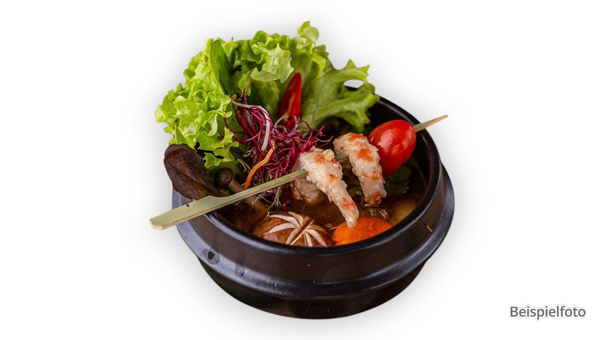 Süß Saure Suppe nach traditionellem südvietnamesischen Rezept, mit frischem Tofu, Tomaten, Champignons, Tamarinde, veredelt mit exotischen Kräutern (pikant)