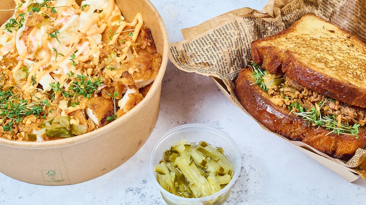 with spicy honey, coleslaw, spicy mayonnaise, fried onions and dill pickles