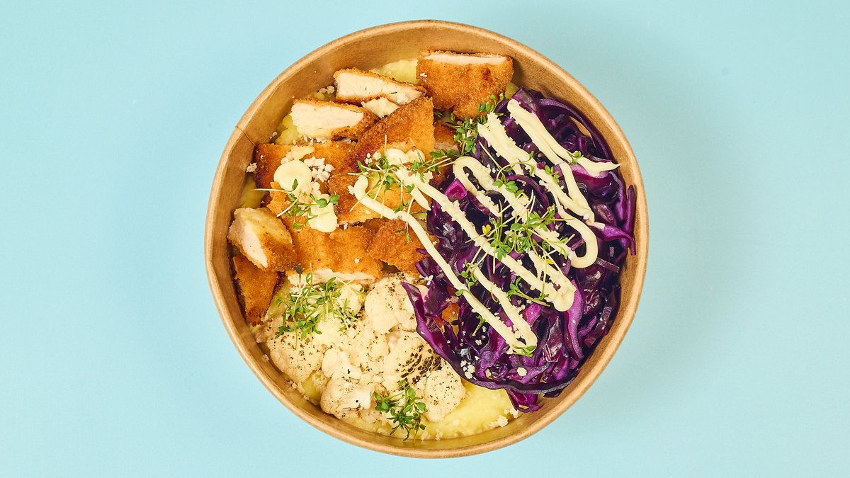 all bowls are prepared with mashed potatoes and chicken schnitzel