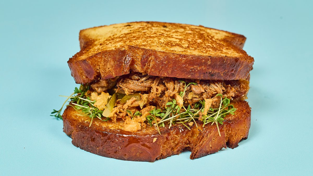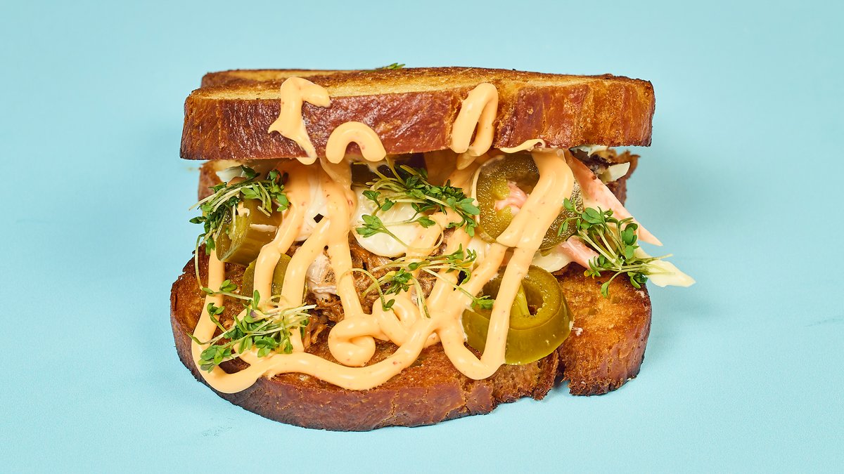 with pulled beef, braised onions, garlic mayonnaise, spicy mayonnaise and fried onions