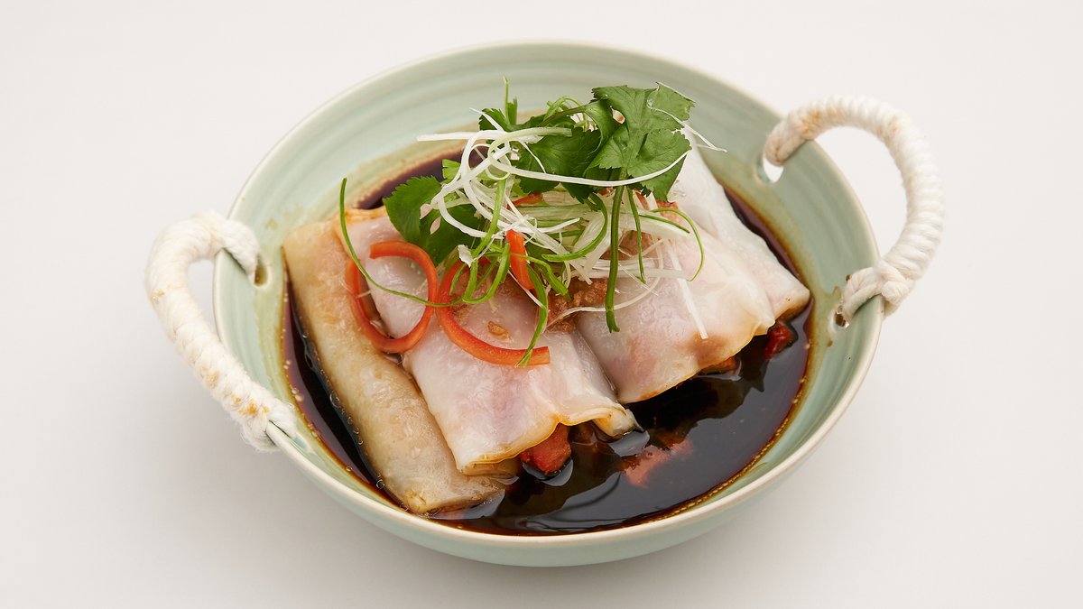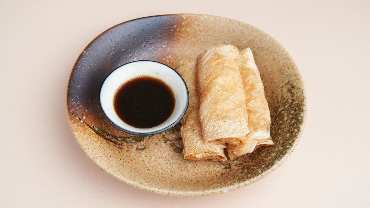 2 Stück Rolle mit Zackenbarsch-Filet, Garnelen, Schweinefleisch, Ingwer, Frühlingszwiebel auf Sojasoße