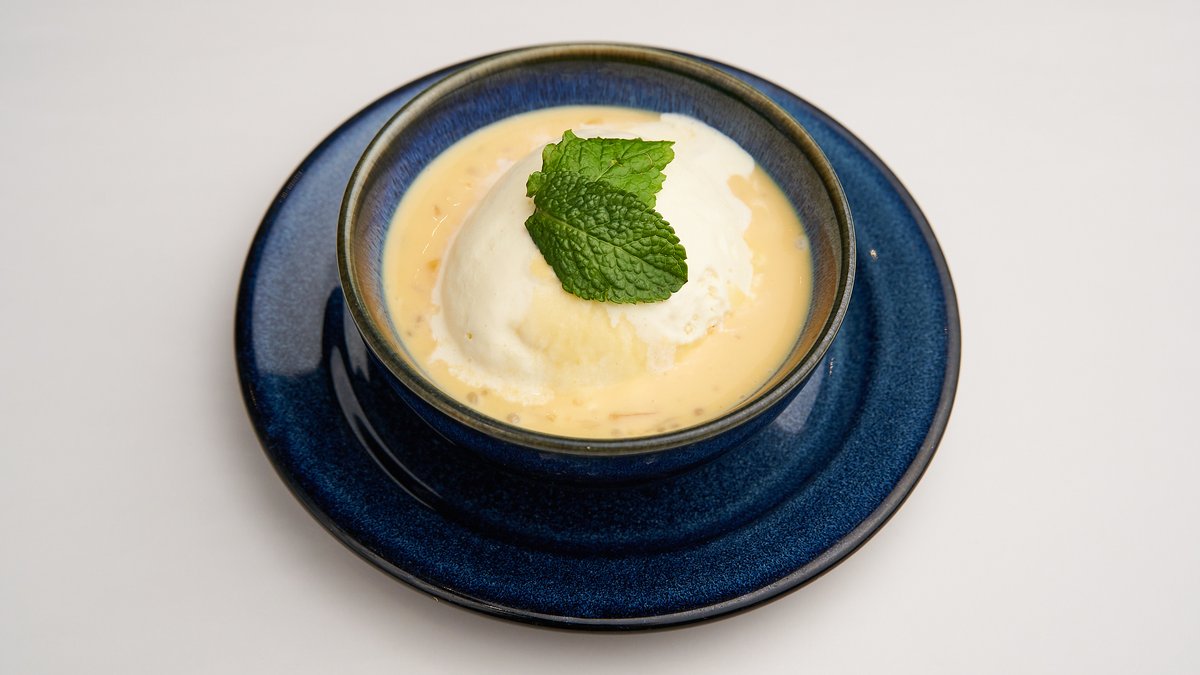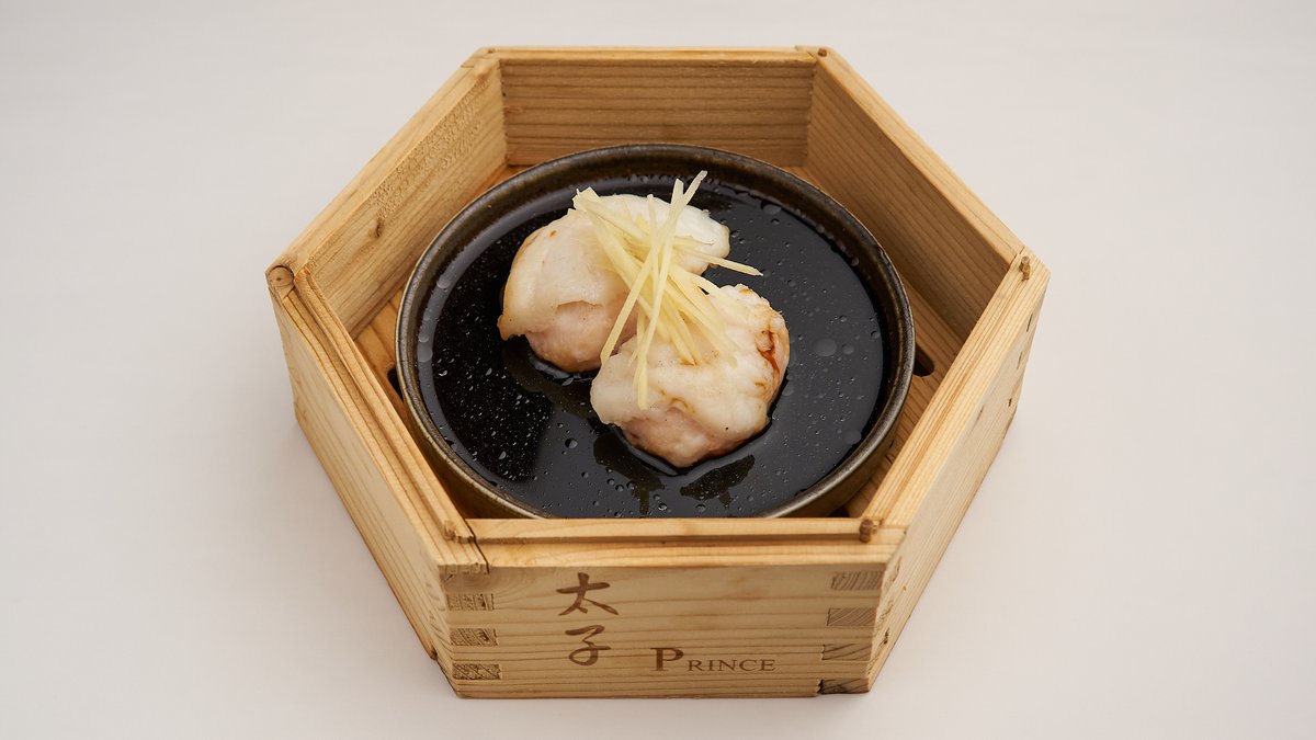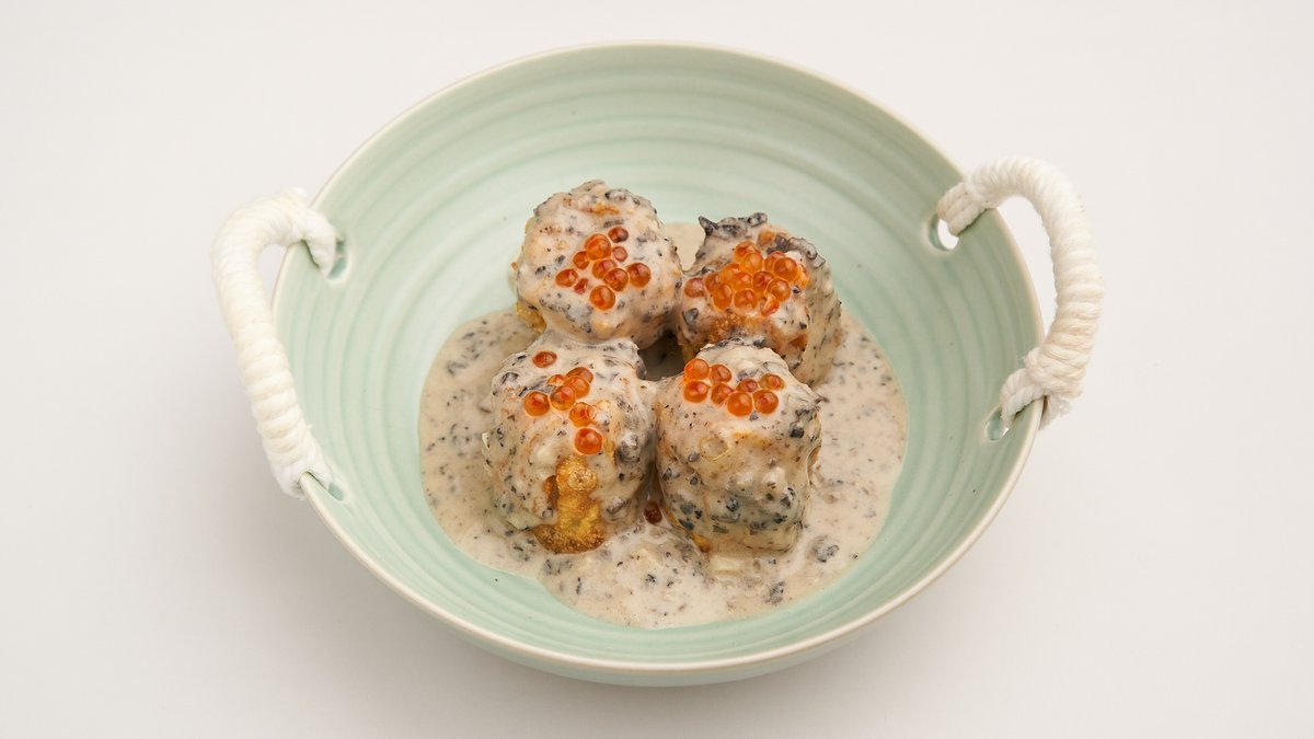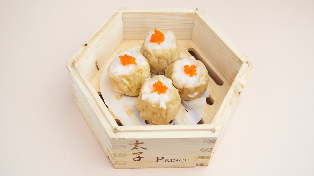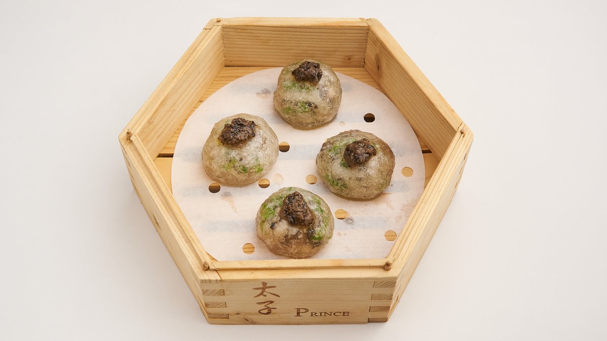 4 Stück Dumpling mit Schwein, Garnelen, garniert mit Trüffelcreme und Kaviar