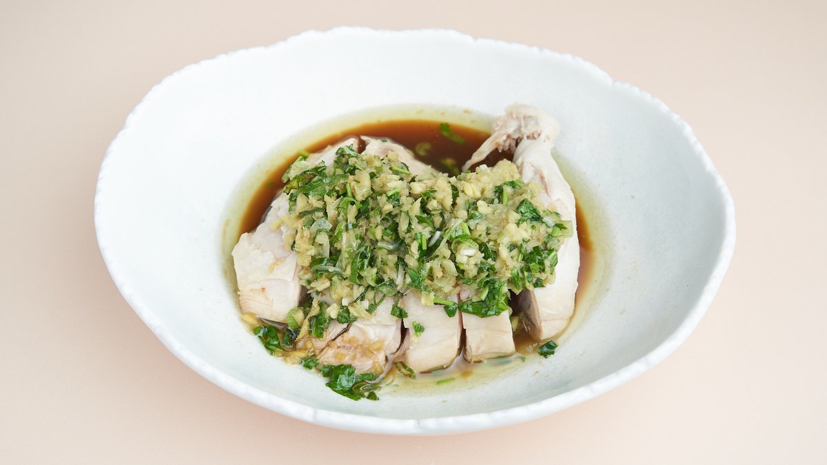 blanchiertes Hühnchen mit Ingwer, Frühlingszwiebeln und Sesamöl