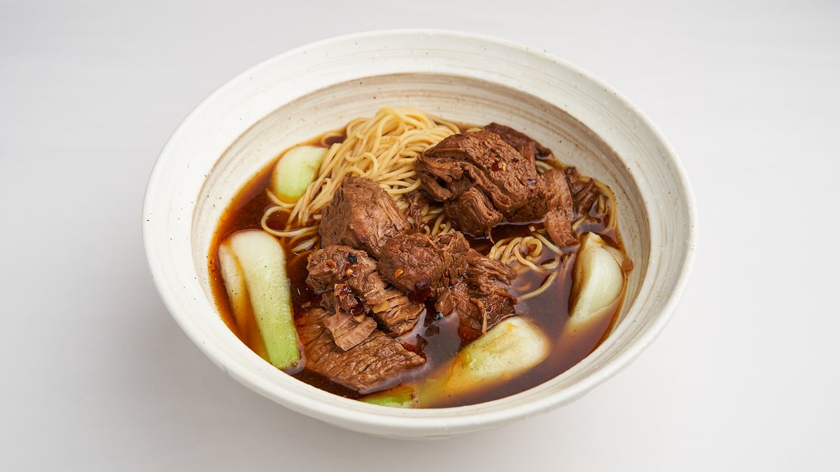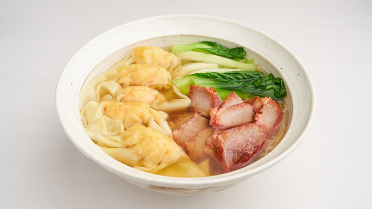 frische Eiernudelsuppe mit Sui Gau-Teigtaschen mit Garnelenfüllung, Char Si und Pak Choi