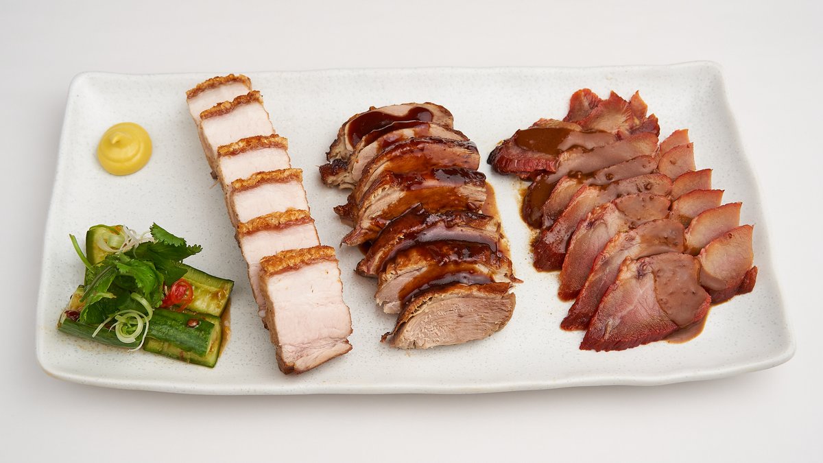 BBQ-Kombination aus Ente, BBQ-Schwein und knusprigem Schweinebauch