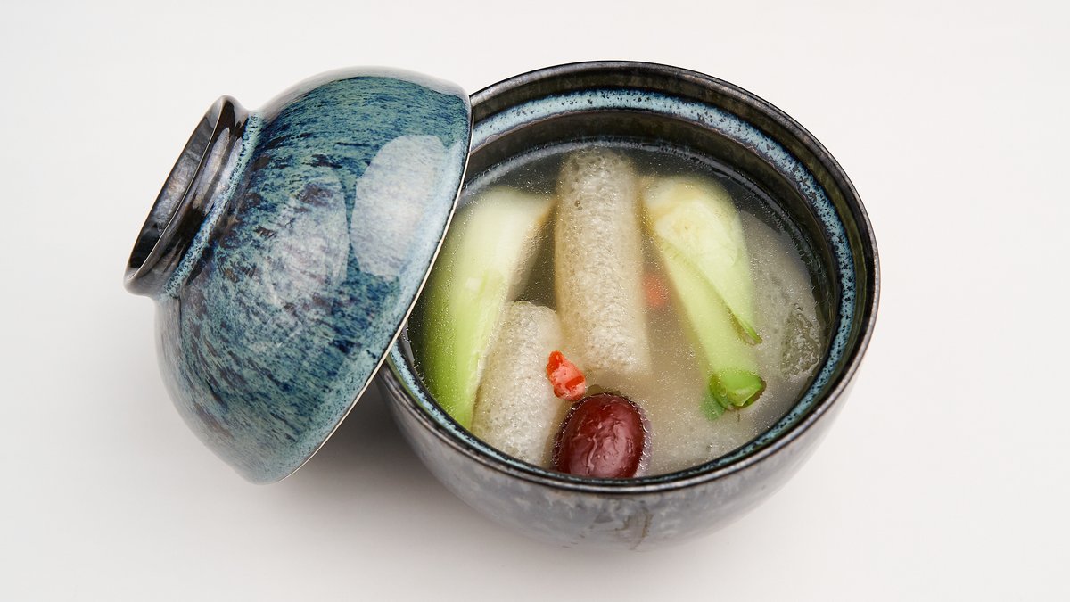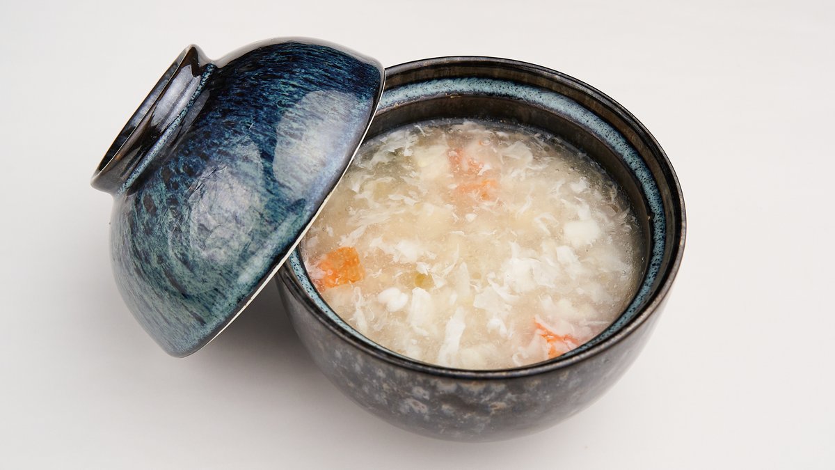 traditionelle schmackhafte Suppe mit Ei, Hähnchen, Tofu und Champignons
