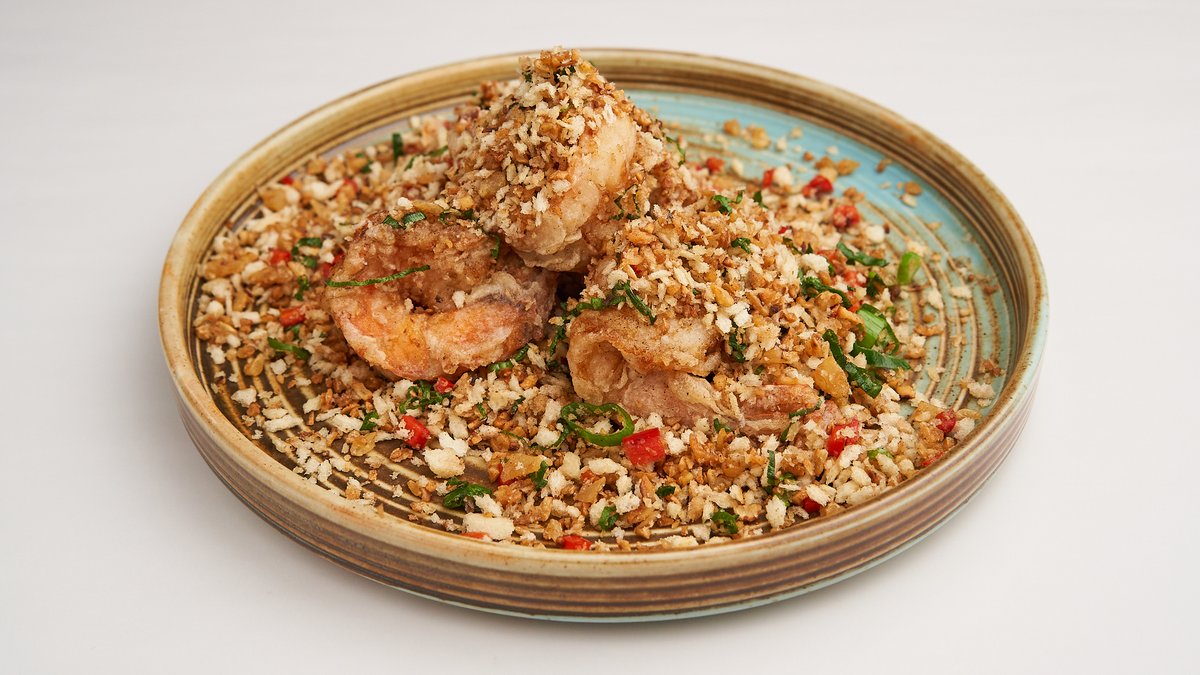 scharf gebratene Garnelen, im Wok umschwenkt mit Chili, Salz und Knoblauch