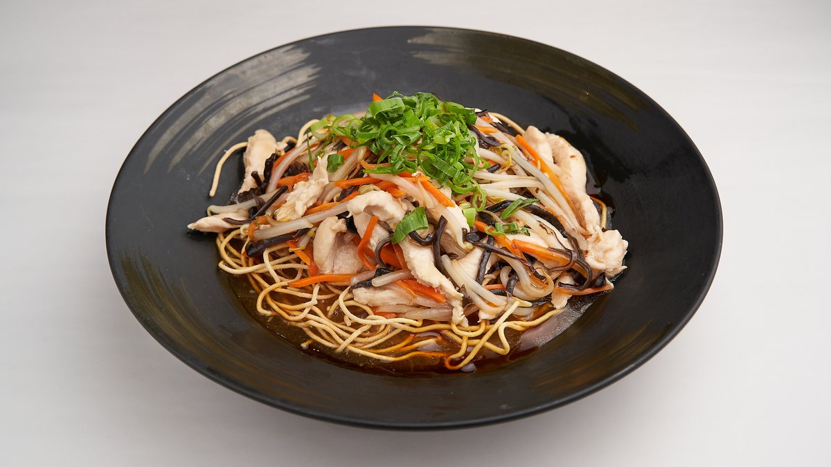 Knusprige Eiernudeln mit gebratenem Hähnchen und buntem Gemüse