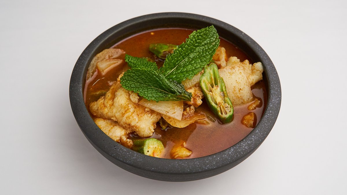 scharf Zackenbarschfilet mit Okraschoten und Tomaten in säuerlicher Soße
