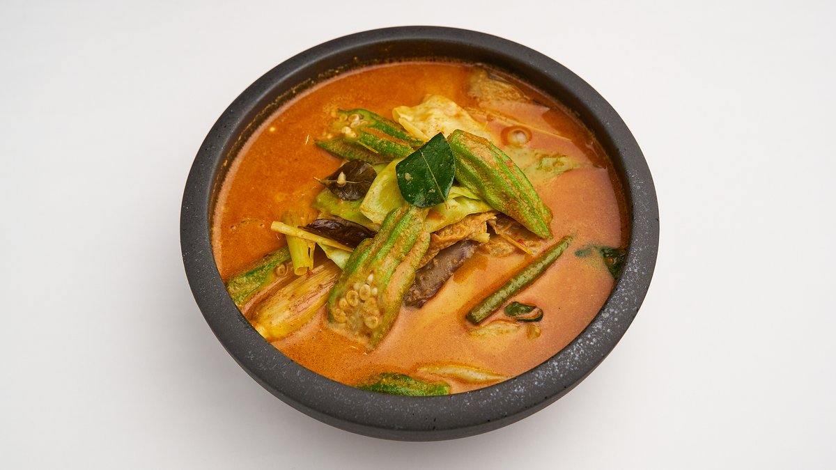 mit Tofu, Okraschoten, Auberginen, lange Bohnen und Spitzkohl in Curry gemischt
