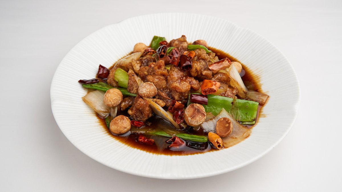 In Wok knusprig, gebratenes Hähnchen mit Macadamia-Nüssen, gerösteten Peperoni, Zuckerbohnen, Frühlingszwiebeln, Zwiebeln