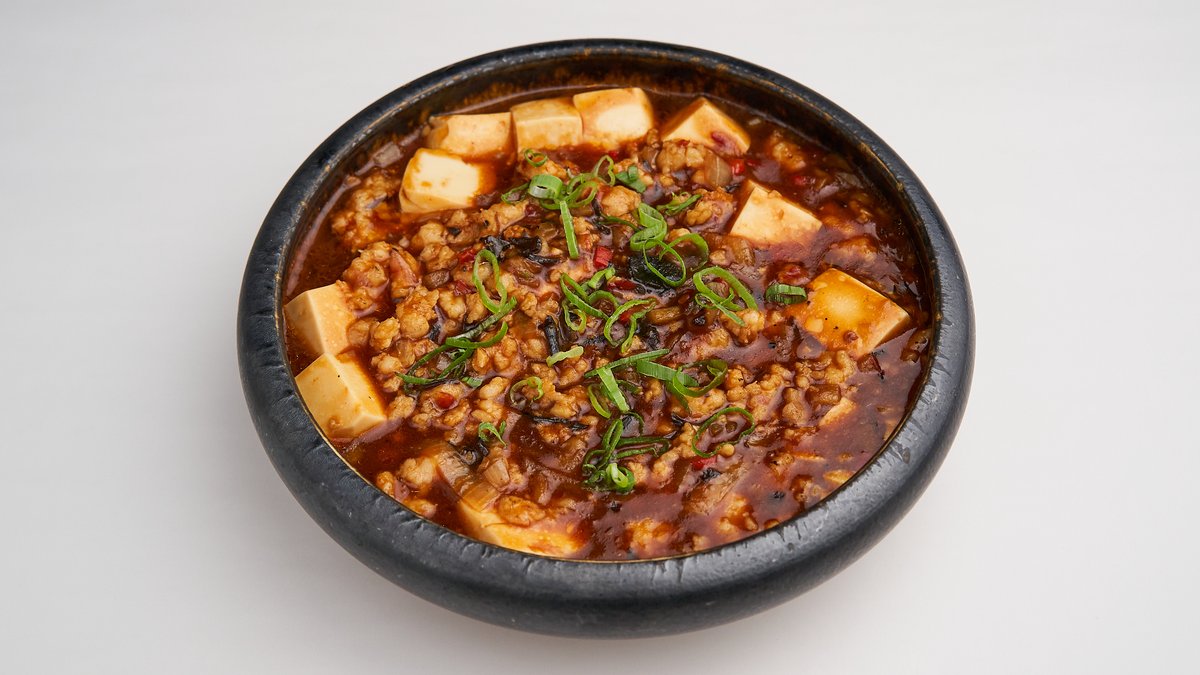 scharf Seidentofu mit Garnelen, Schweinefleisch, Tungku-Pilzen und Zwiebeln