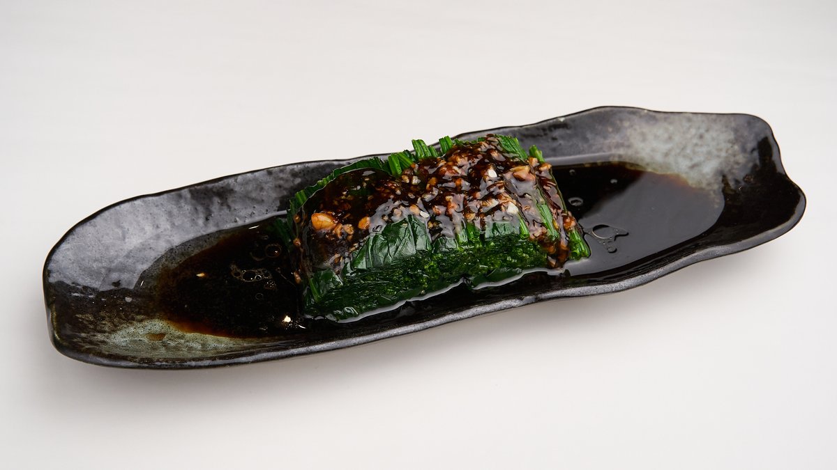 Blanchierter Spinat, garniert mit Sojasoße Knoblauch und Sesamöl