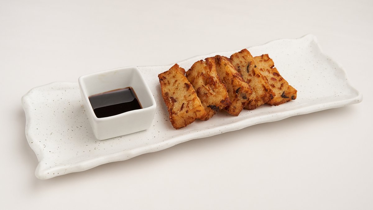 Kuchen aus Rettich mit getrockneten Garnelen, Schinken