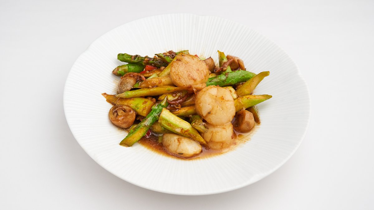 Jakobsmuschel und Spargel, im Wok gebraten mit XO-Soße