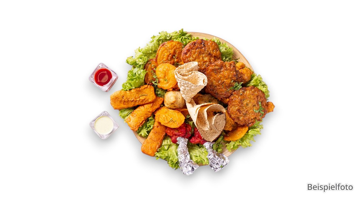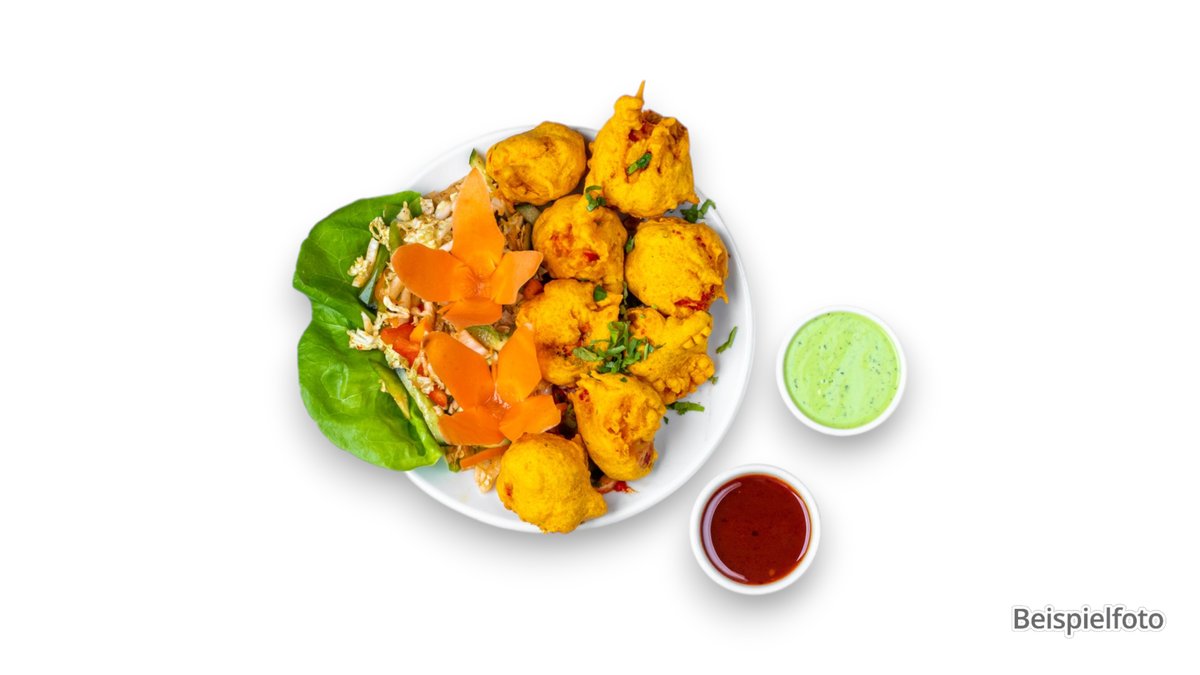 mixed starter plate with samosa, chicken pakora, gobi pakora, paneer pakora, aloo tikki and baingan pakora