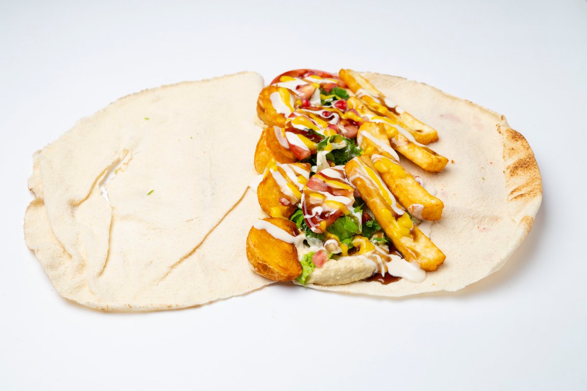 für 2 Personen mit Falafel, Halloumi, Makkali, Batata Harra, Salat, 2x Hähnchenspieß, 1x Kufta-Spieß, 1x Lammspieß, Gegrillte Zwiebel und Tomate, Muhammara Brot, Mezze-Mix und Soße.
