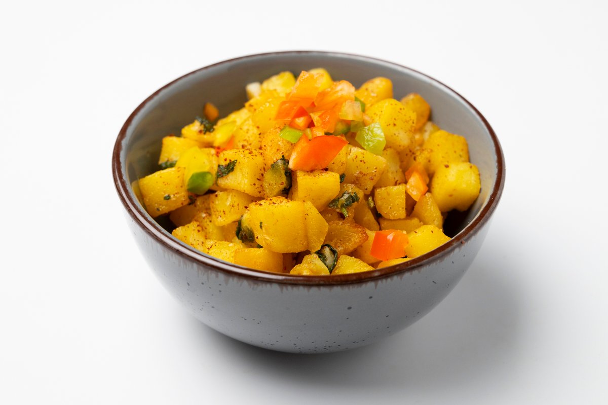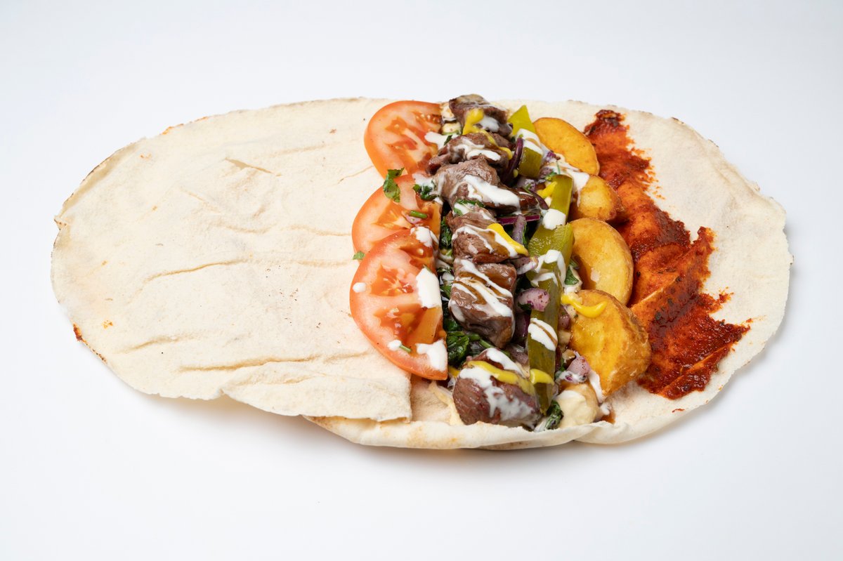 für 2 Personen mit Batata Harra, Salat-Mix, 4x Hähnchenspieß, 3x Kufta-Spieß, 3x Lammspieß, und Knoblauchsoße.