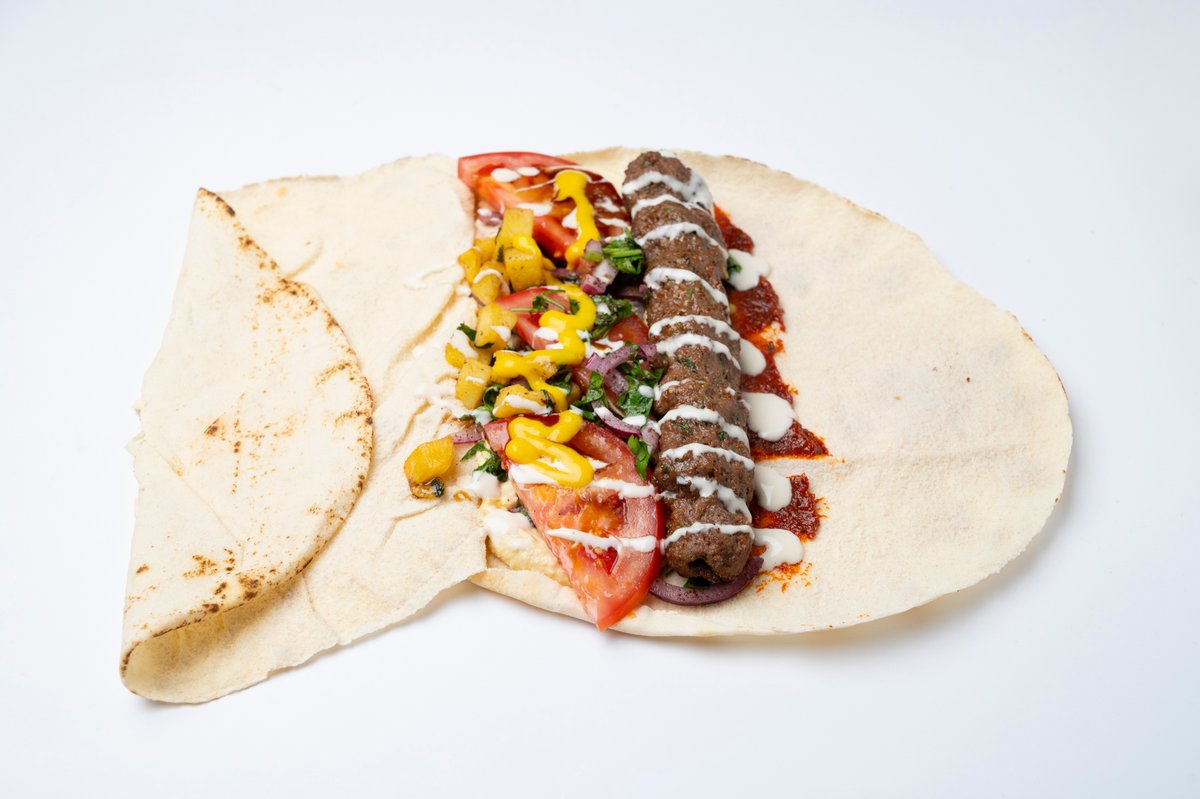 2x Kuftaspiess mit Gegrillter Zwiebel und Tomate, mezze, Salat und eine Beilage