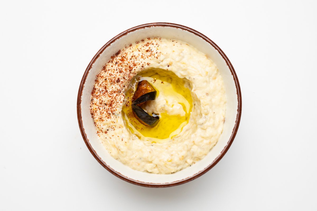 mit Hummus, Baba Ghanoush, Muttabal und Muhammara Mix