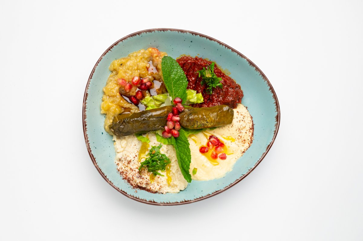 mit Baba Ghanoush, Hummus, Mutabbal und Weinblättern