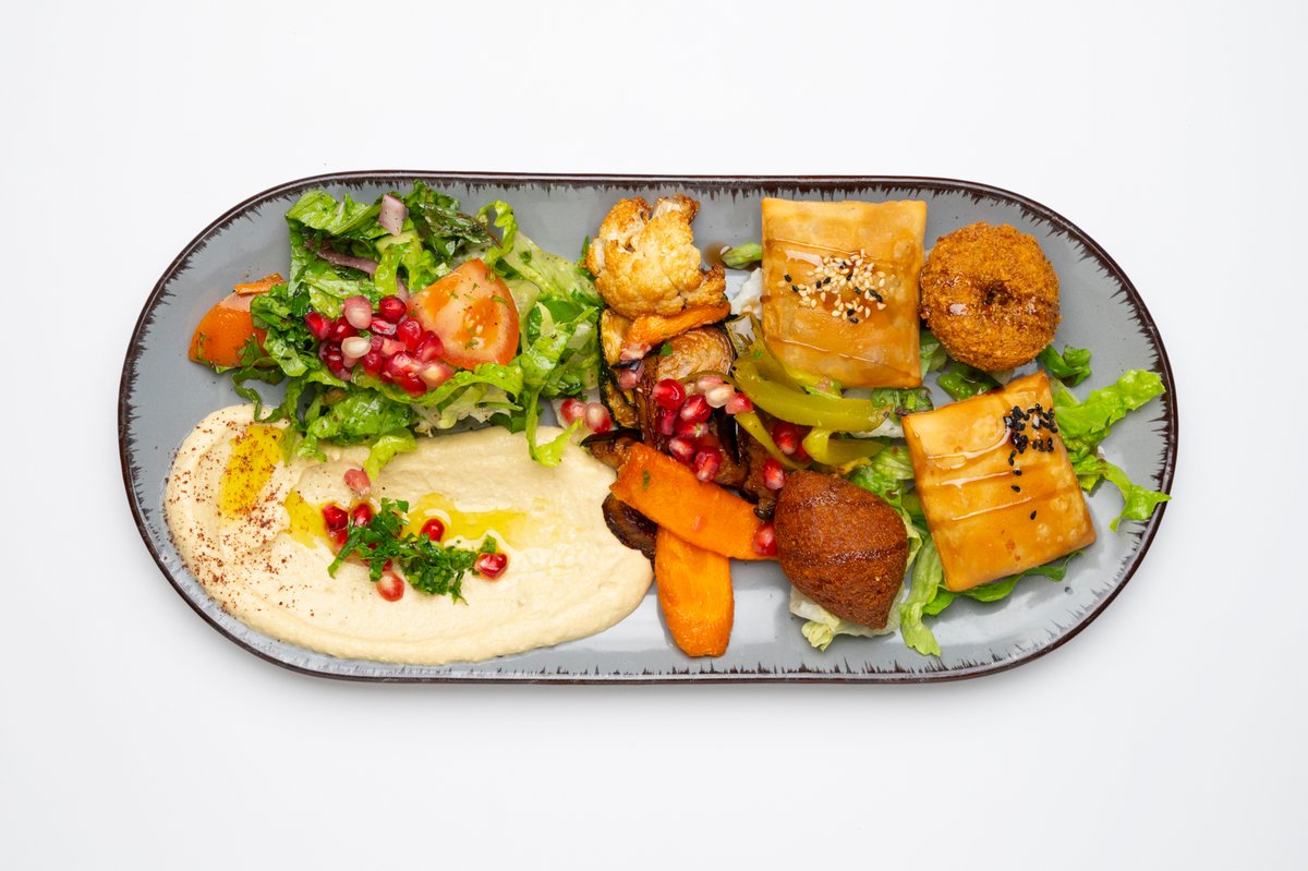 für 2 Personen mit Falafel, Halloumi, Makkali, Batata Harra, Salat und sämtliche Soßen.