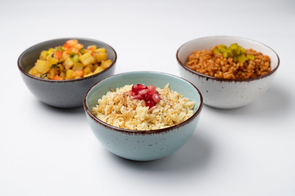 alle Gerichte werden mit einer Beilage deiner Wahl serviert („23. Weinblätter-Teller”, „24. Kibbeh-Teller”, „25. Fatteh-Teller” und „26. Foul-Teller” werden ohne Beilage serviert)