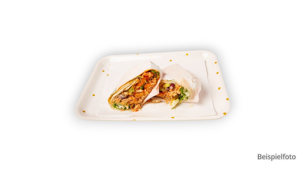 große Weizenmehltortilla gefüllt mit gemischtem Gemüse, Zwiebeln, Reis und Bohnen