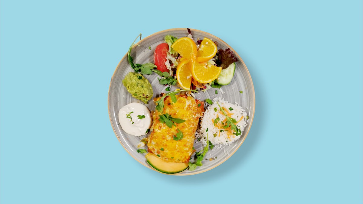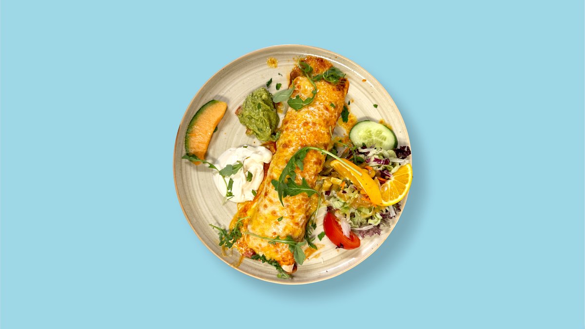 2x Weizenmehltortillas gefüllt mit Rinderhackfleisch, Käse, Sauerrahm, Avocadocreme und Salat