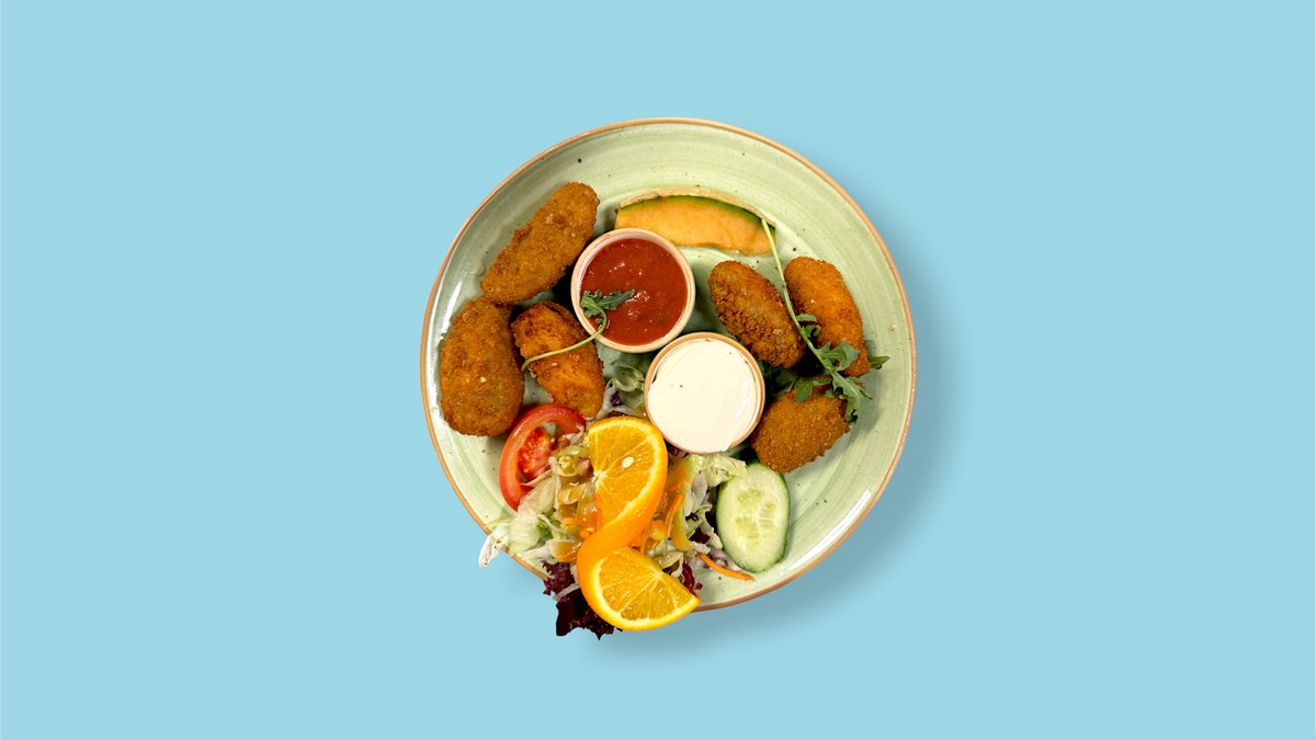 6 frittierte Chickennuggets mit Sauerrahm und Avocadocreme.