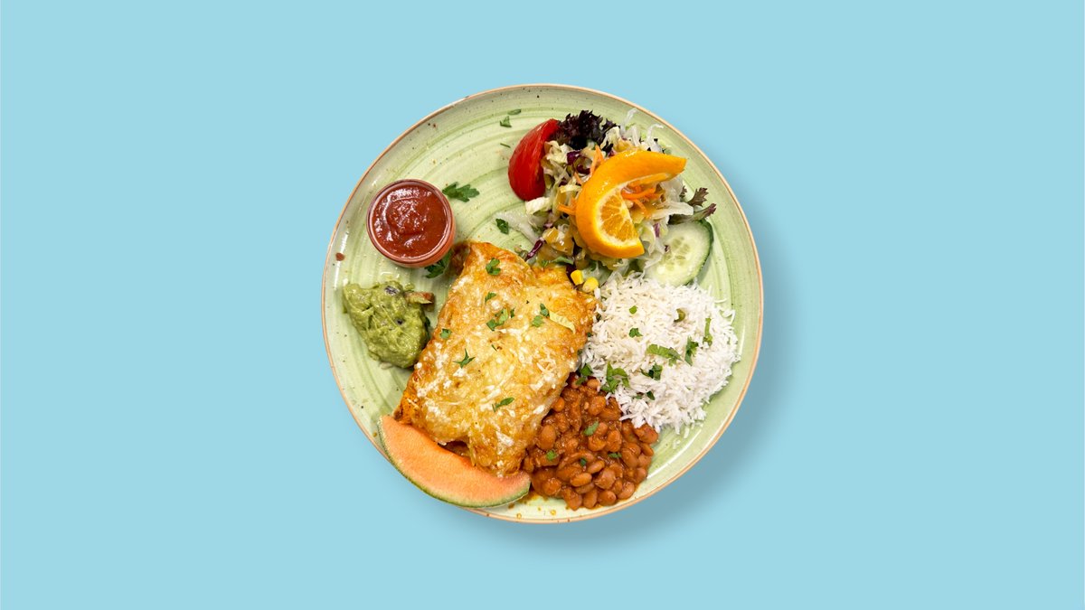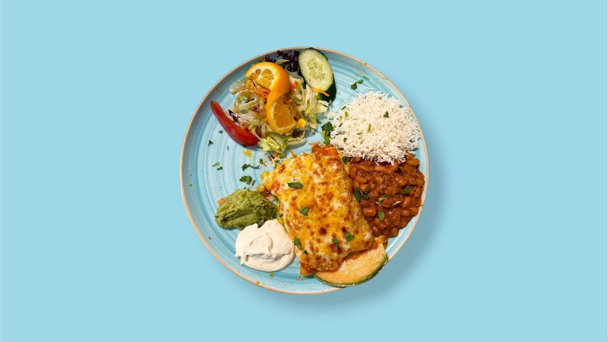 große frittierte Weizenmehltortilla gefüllt mit verschiedenem Gemüse, Rancherosoße und Reis