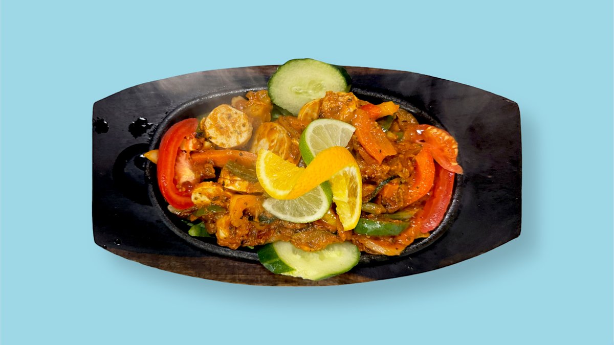 gebratene Rinderhüftstreifen und Hähnchenbruststreifen, serviert in mit geschmorten Zwiebeln, Champignons, Paprika und Tomaten, dazu vier Tortillas.