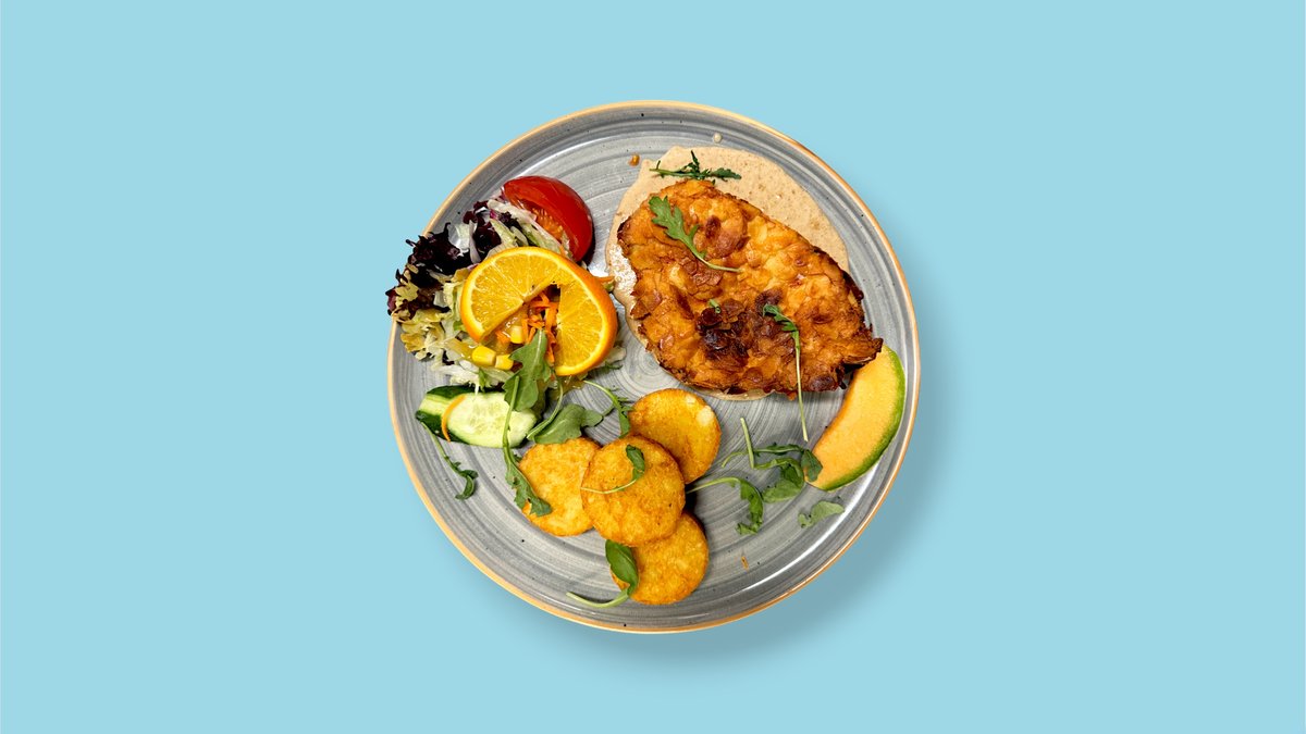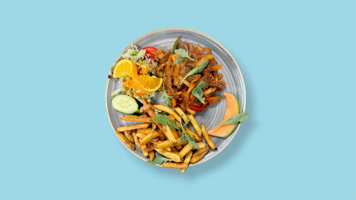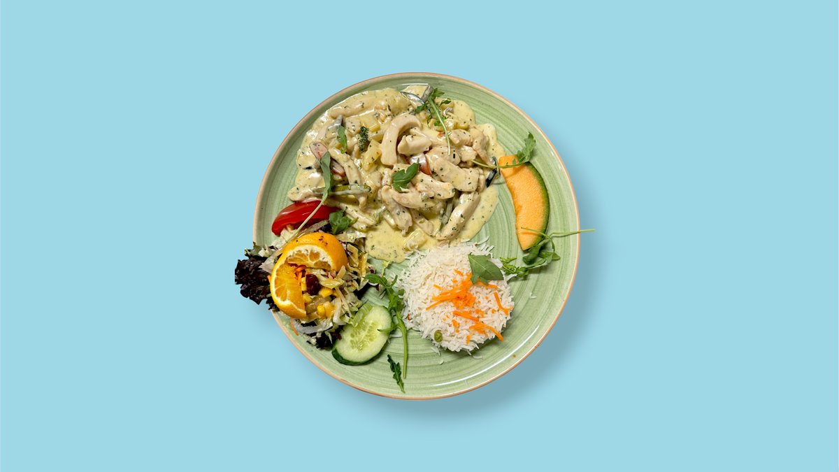 gemischter Salat mit gebratenen marinierten Hähnchenstreifen mit Mango, milden Chili, Blattschoten, Kidneybohnen, Mais und Cheddarkäse, dazu frisches Obst.