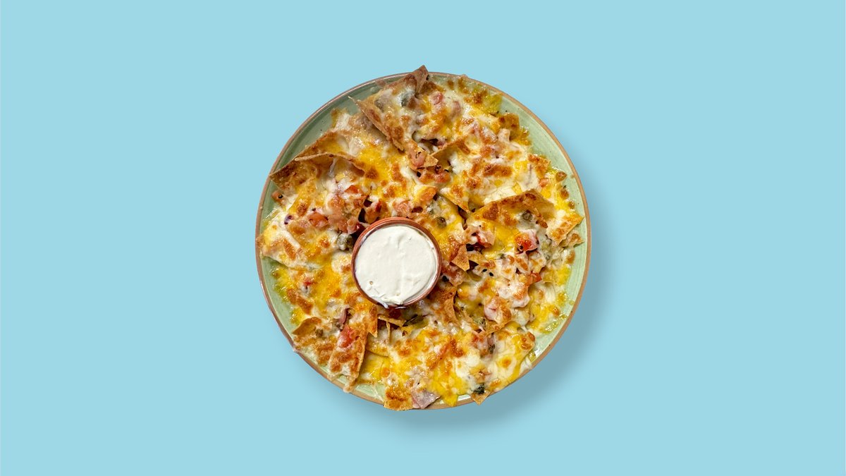 Tortillachips mit Tomaten, Zwiebeln, Jalapeños, Käse überbacken und Sauerrahm