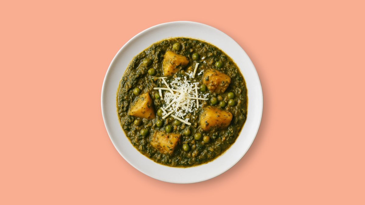 scharf würziger Rahmspinat mit Kartoffeln, Erbsen, frischen Ingwer, Currysoße und mit geriebenem Rahmkäse garniert