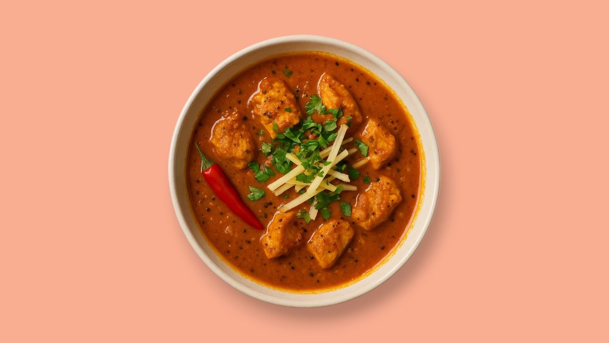scharf gebratene Lammfleischwürfel mit frischen Tomaten, Paprika, Knoblauch, Ingwer, Zwiebeln, Tomaten-Masalasoße und Röstzwiebeln