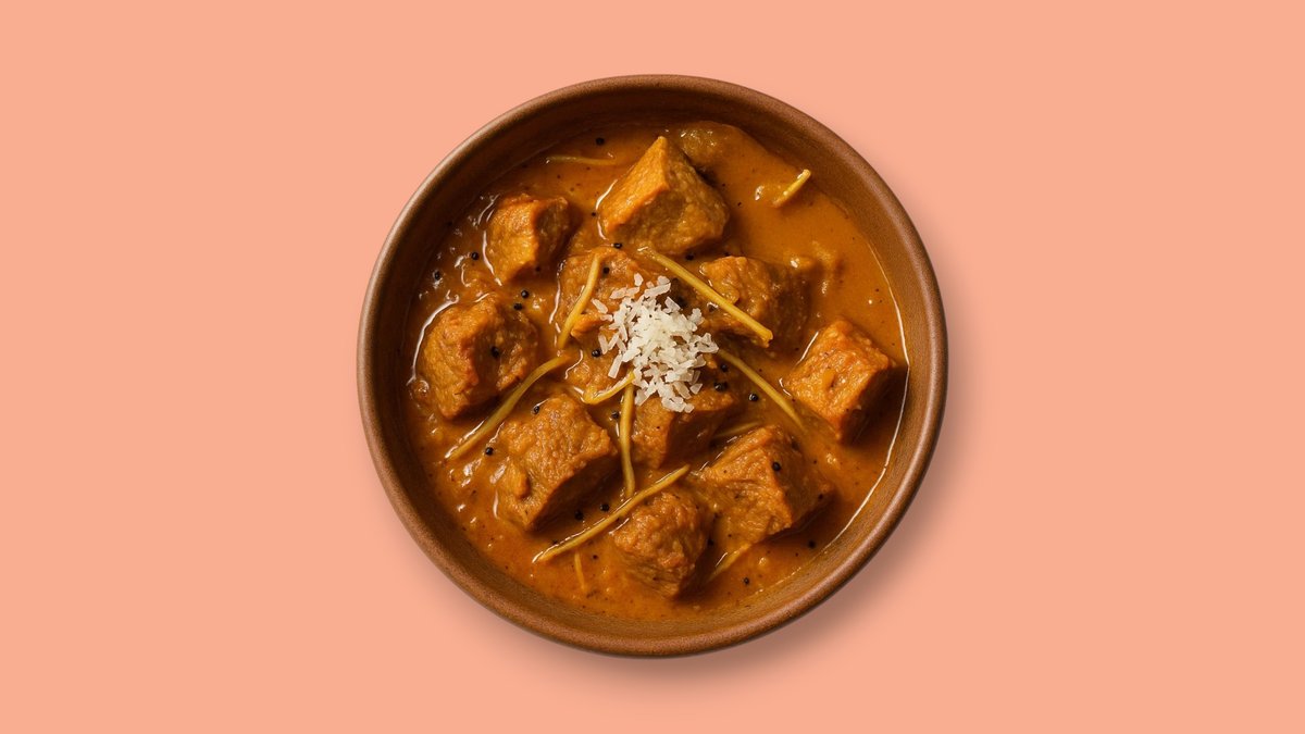 scharf Lammfleischwürfel mit Senfkörnern, Kokos-Currysoße und Ingwerstreifen