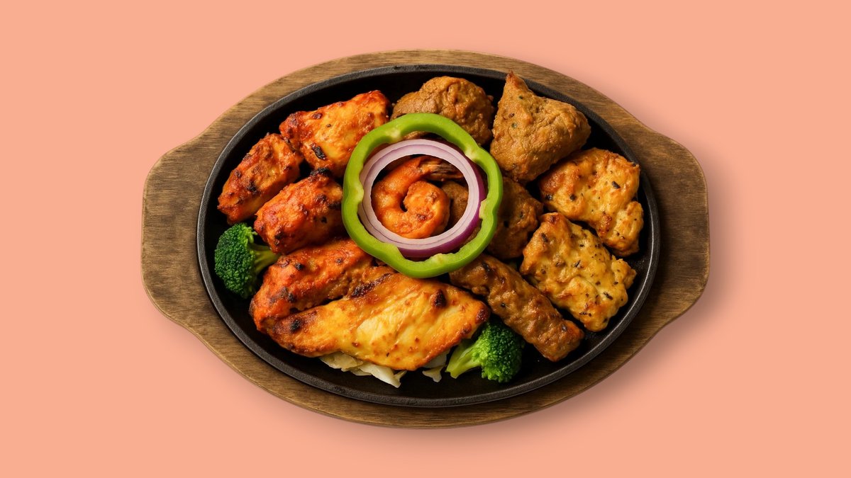 Mischung aus Chicken Tandoori, Chicken Tikka, Kalmi Kebab, Lamm Tikka, Sikh Kebab und Großgarnelen