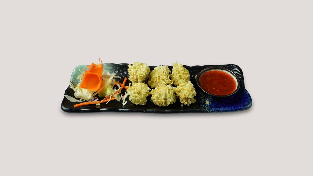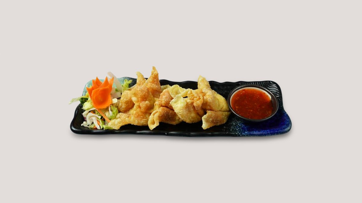 5 Stück frisch und knusprig gebackene Wan Tan gefüllt mit Garnelen, Hähnchen und Gewürzen, serviert mit kleinem Beilagensalat und Süß-Sauer-Soße