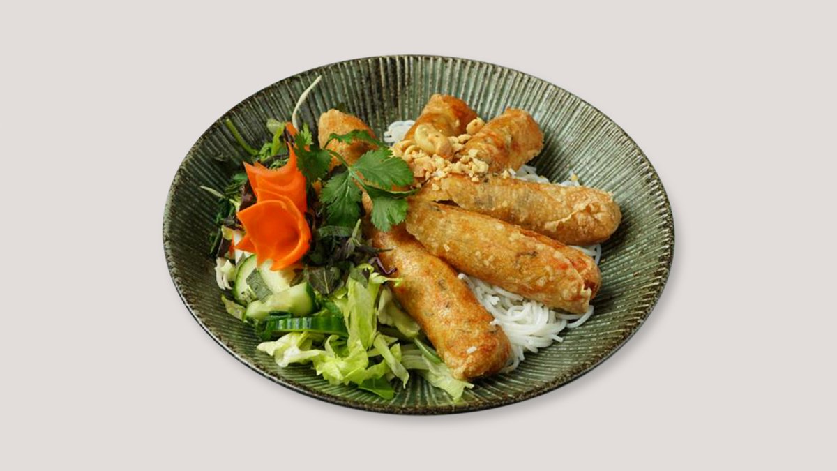 laumwarm hausgemachte vegane Frühlingsrollen (gefüllt mit veganem Hähnchenfleisch, Morcheln, Shiitakes und Gemüse) mit gedämpften Reisnudeln, frischem Salat, frischen Kräutern, Erdnüssen, Kaschunüssen und hausgemachter Chili-Limetten-Ingwer-Soße
