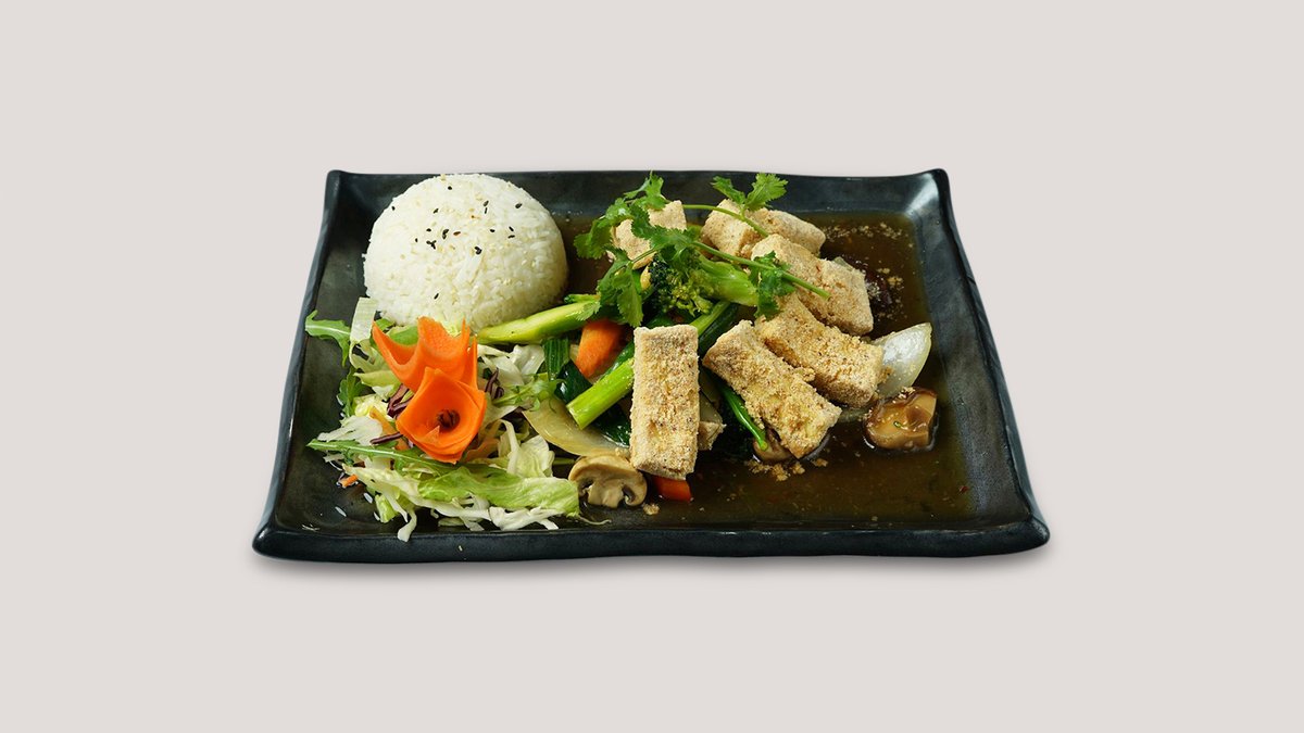 gebackener Tofu und vegane knusprige Ente paniert in einer hausgemachten Panade aus Reis, Bohnen, Zitronengras, Salz und Pfeffer, mit gemischtem Gemüse, grünem Pfeffer, dunkler Soße und Reis