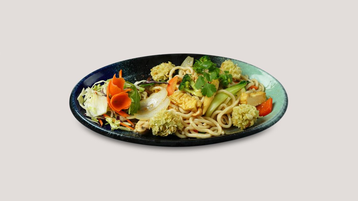gebratene Udon-Nudeln mit Tofu, Hähnchenfleisch-Imitat, grünem Klebreis, Shiitakes, Pak Choi, Zwiebeln, Erdnüssen, Koriander und gemischtem Gemüse