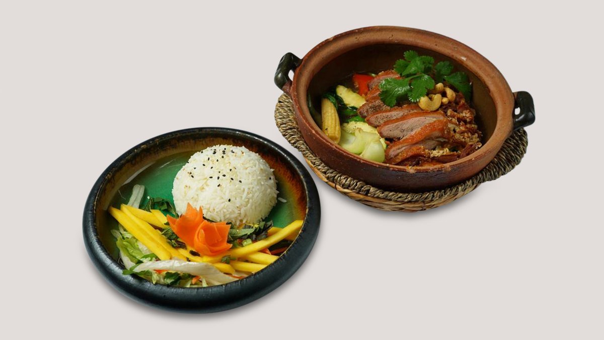 mit geschmorten Shiitakes, Tofu, Hähnchenfleisch-Imitat, Zuckerschoten, grünem Spargel, Babymais, Tomaten, Paprika, Zwiebeln, Koriander, Erdnüssen und Lotuswurzel im Tontopf mit Reisnudeln